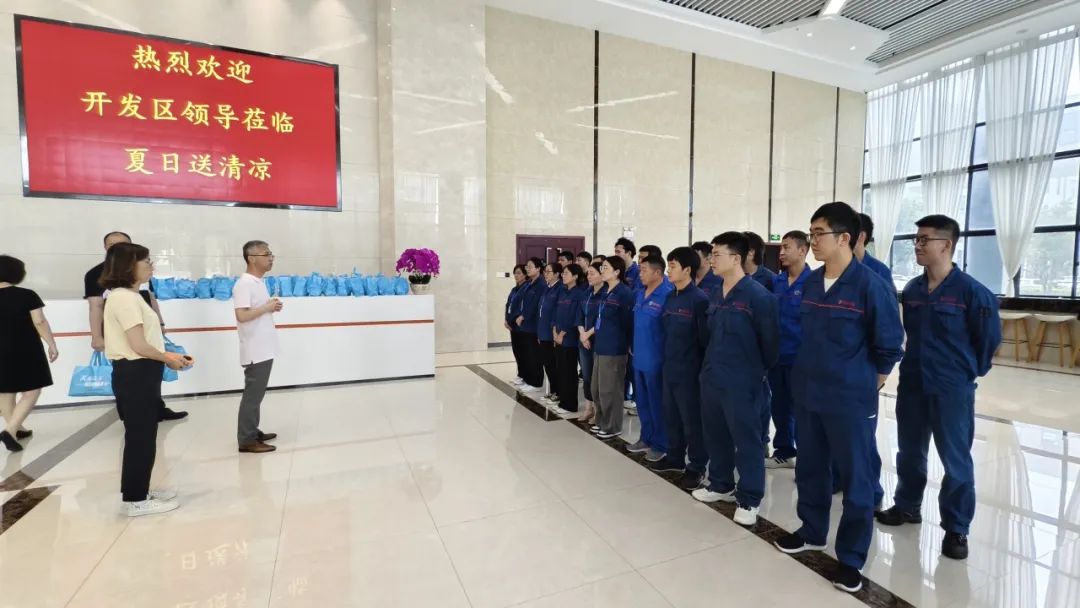 在哈尔滨基地,哈尔滨新区相关领导带领区总工会送来了避暑饮品和用品,深切问候一线员工的身体情况,了解企业运行的动态,转达区委区政府对我司的牵挂,高度肯定哈基地为区里的经济建设做出的贡献。