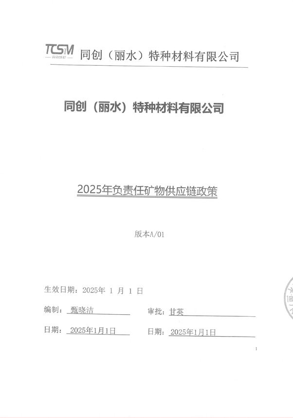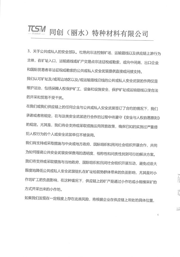同创普润集团及下属子公司承诺严格遵守相关法律法规和国际规则,坚决避免采购高风险地区的不合规原材料,坚持非冲突矿产认证,坚守诚信,保证信誉,增强消费者和投资者信任,履行环保、劳工权益等社会责任,促进供应链长期可持续发展。